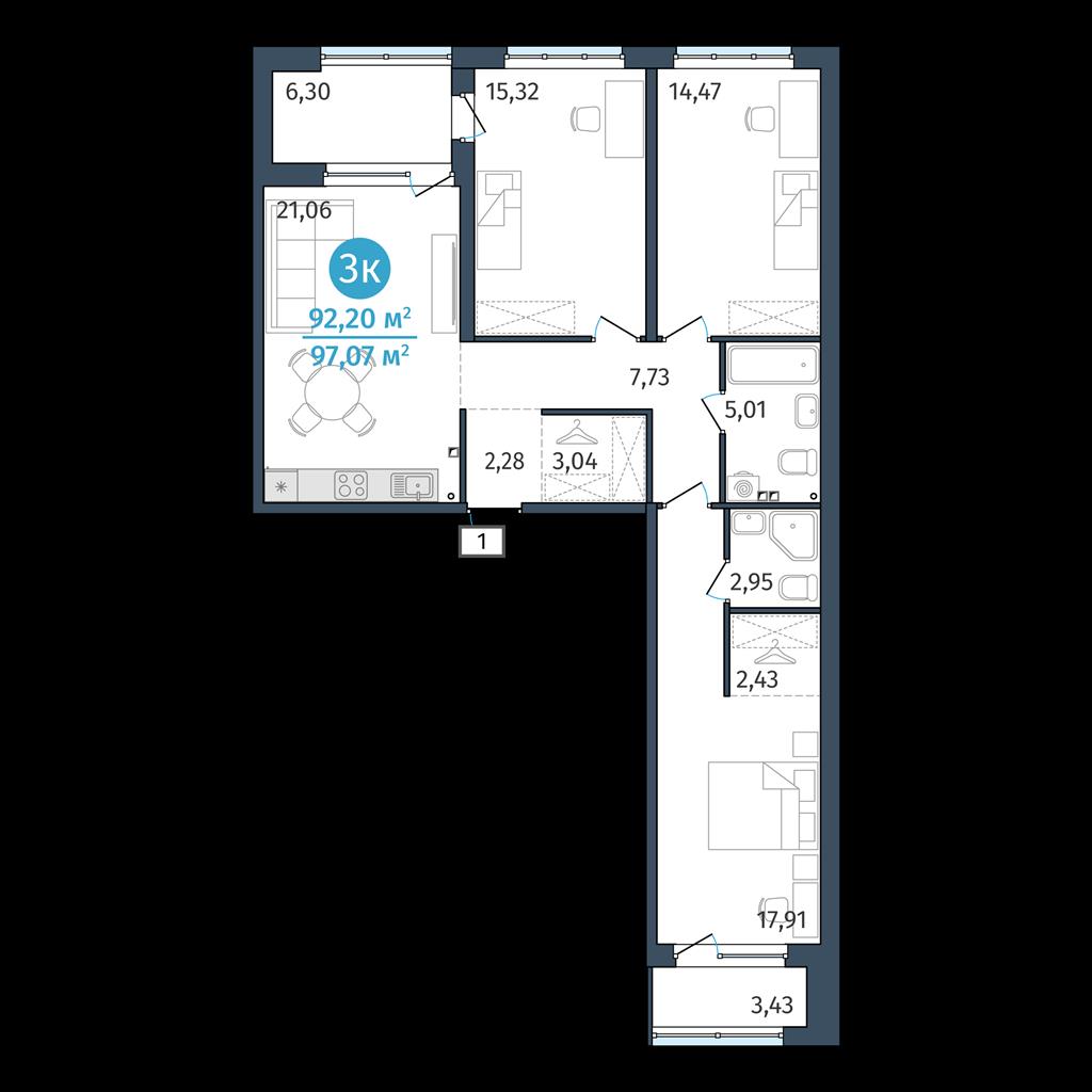 общая 92,2 м2, жилая 0 м2, кухни 21,06 м2 |