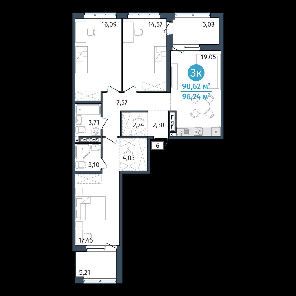 общая 90,62 м2, жилая 0 м2, кухни 19,05 м2 |