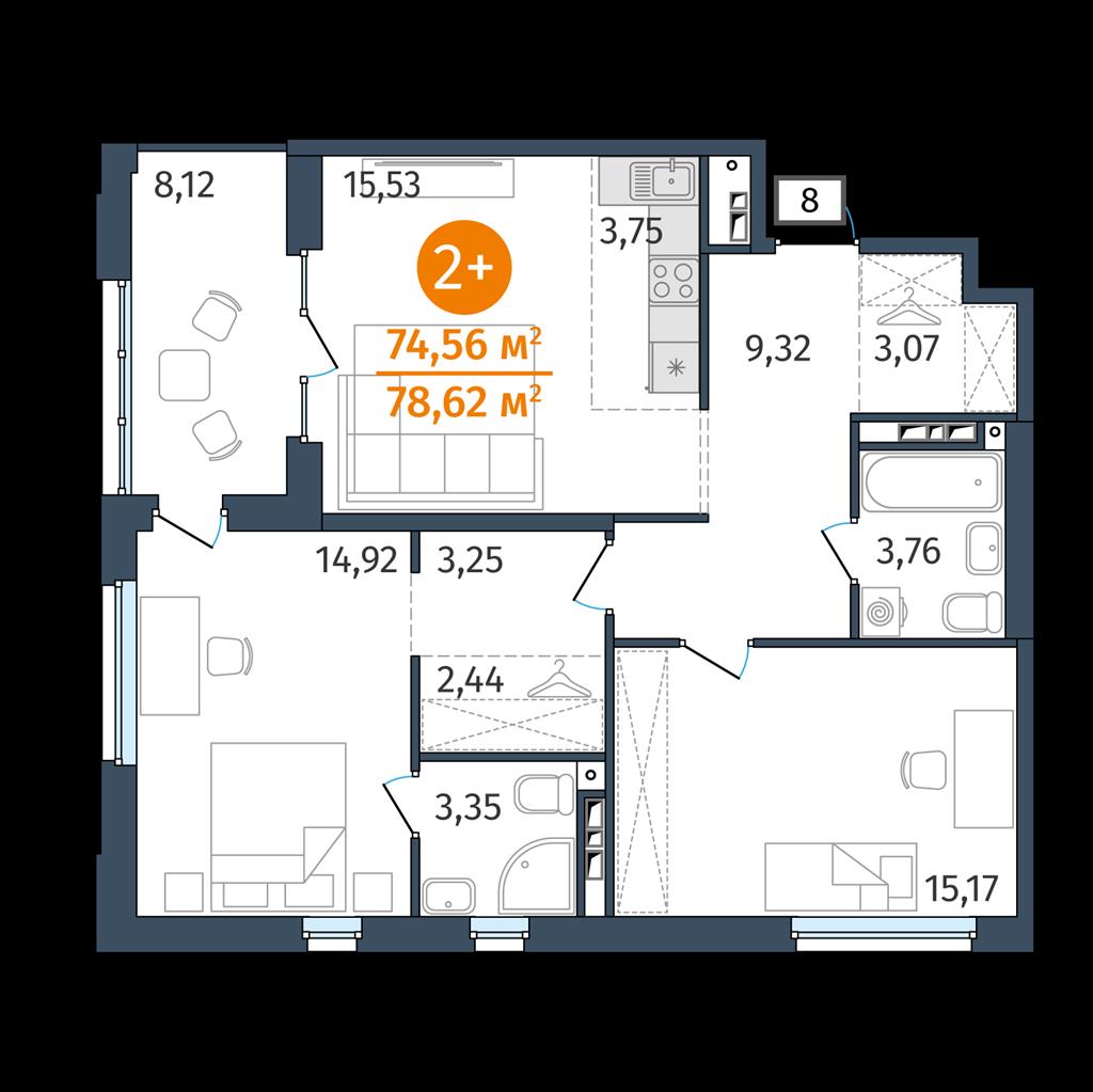 общая 74,56 м2, жилая 0 м2, кухни 3,75 м2 |