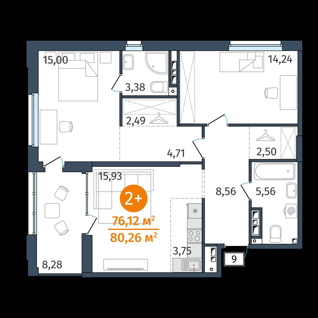 общая 76,12 м2, жилая 0 м2, кухни 3,75 м2 |
