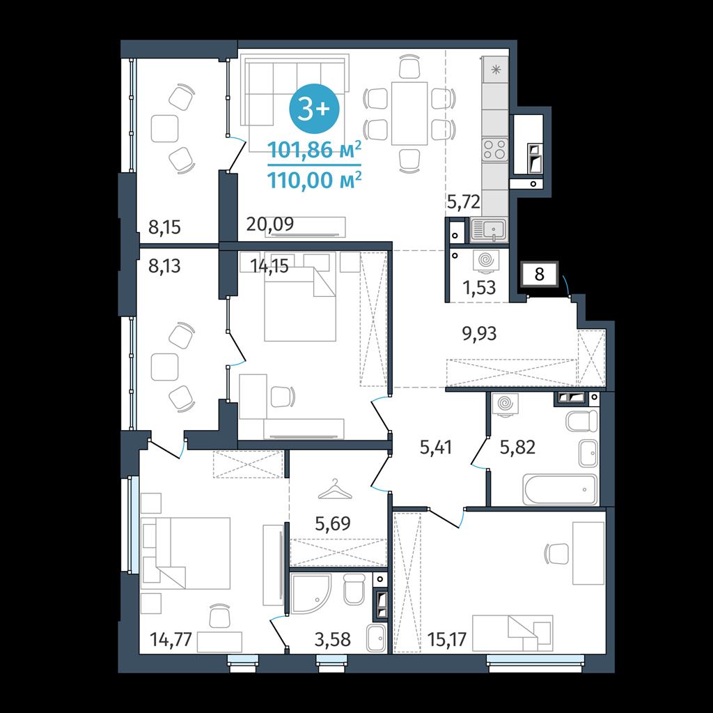 общая 101,86 м2, жилая 0 м2, кухни 5,72 м2 |