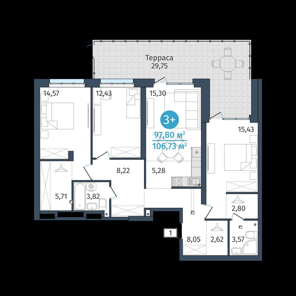 общая 97,8 м2, жилая 0 м2, кухни 5,28 м2 |