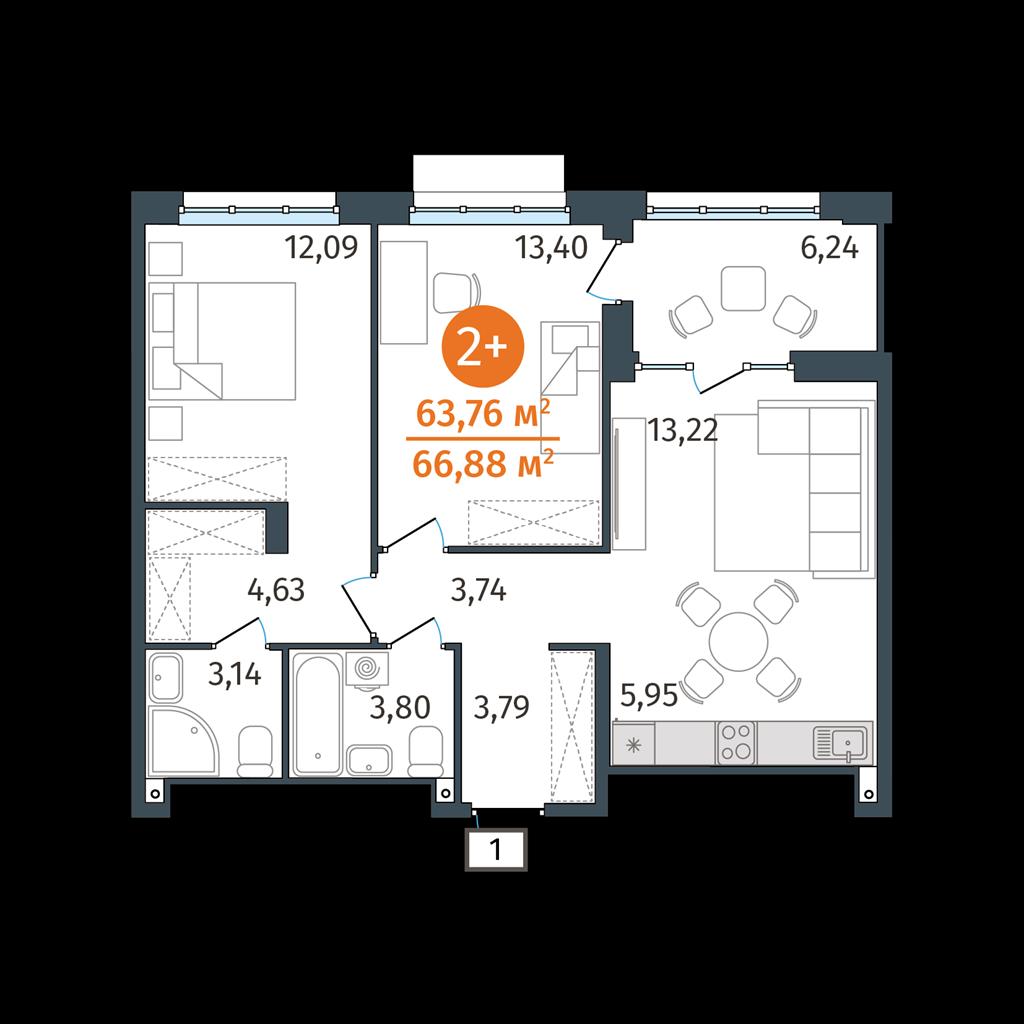 общая 63,76 м2, жилая 0 м2, кухни 5,95 м2 |