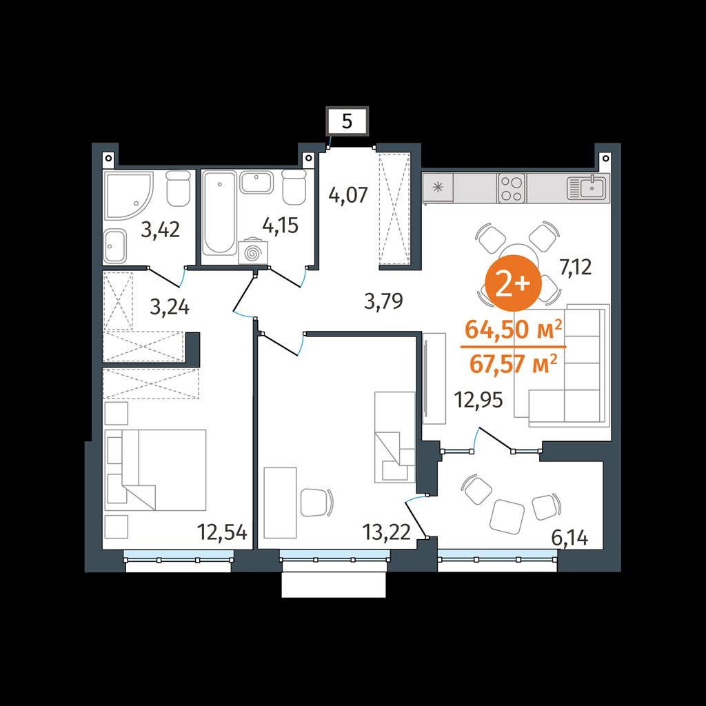 общая 64,5 м2, жилая 0 м2, кухни 7,12 м2 |