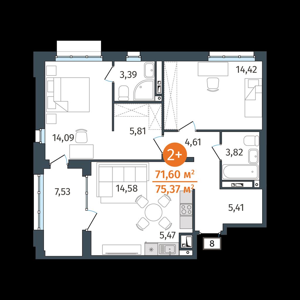 общая 71,6 м2, жилая 0 м2, кухни 5,47 м2 |