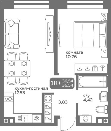 общая 36,54 м2, жилая 0 м2, кухни 17,53 м2 |