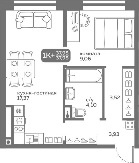 общая 37,98 м2, жилая 0 м2, кухни 17,37 м2 |
