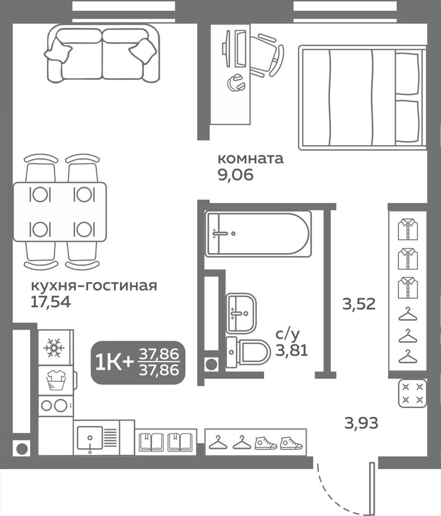 общая 37,86 м2, жилая 0 м2, кухни 17,54 м2 |