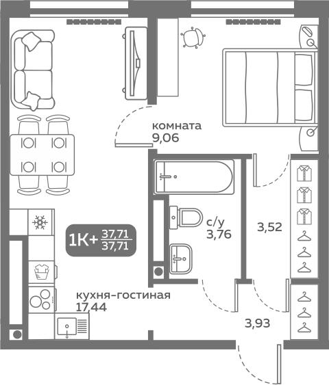 общая 37,71 м2, жилая 0 м2, кухни 17,44 м2 |