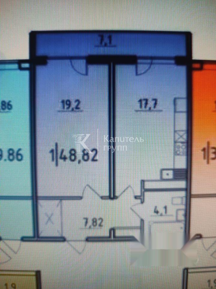 общая 48,6 м2, жилая 19,2 м2, кухни 17,7 м2 |