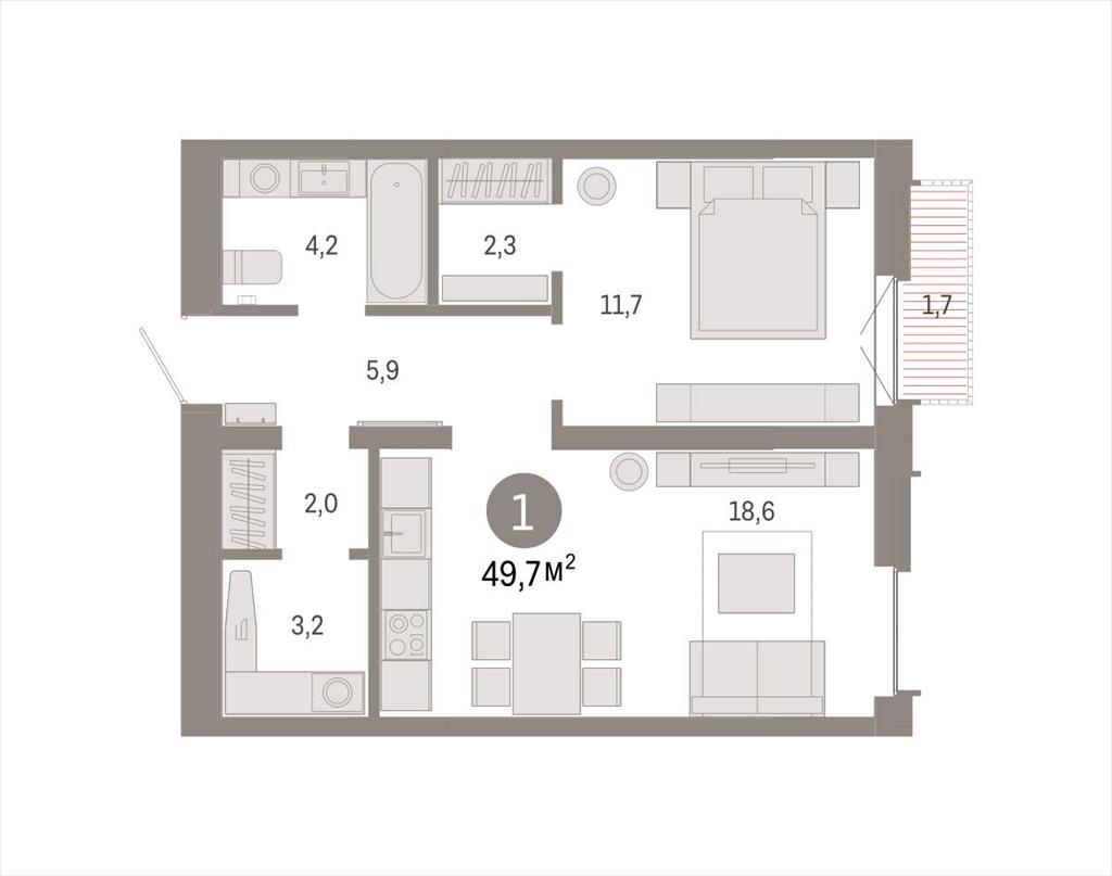 | Квартира с кухней-гостиной и одной спальней в жилом районе «Республики 205». Особенности планировки: предчистовая отделка, балкон, гардеробная, вид во двор, постирочная.