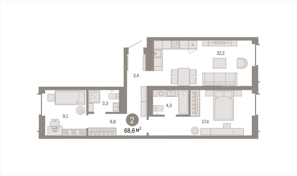 Квартира с кухней-гостиной и двумя спальнями в жилом районе «Республики 205». Особенности планировки: предчистовая отделка, мастер-спальня, вид во двор, разнесённые спальни.