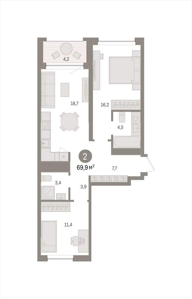 Двухкомнатная квартира 69,87 м2 по ул. Муравленко 9к3 за 12380000 руб. |