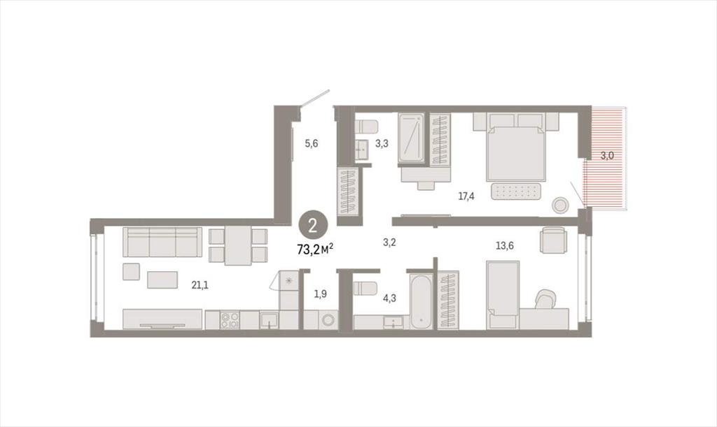 Двухкомнатная квартира 73,18 м2 по ул. Республики 203к1 за 10520000 руб. |