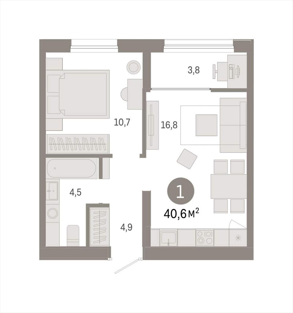 | Квартира с кухней-гостиной и одной спальней в жилом районе «Республики 205». Особенности планировки: предчистовая отделка, тёплая лоджия.