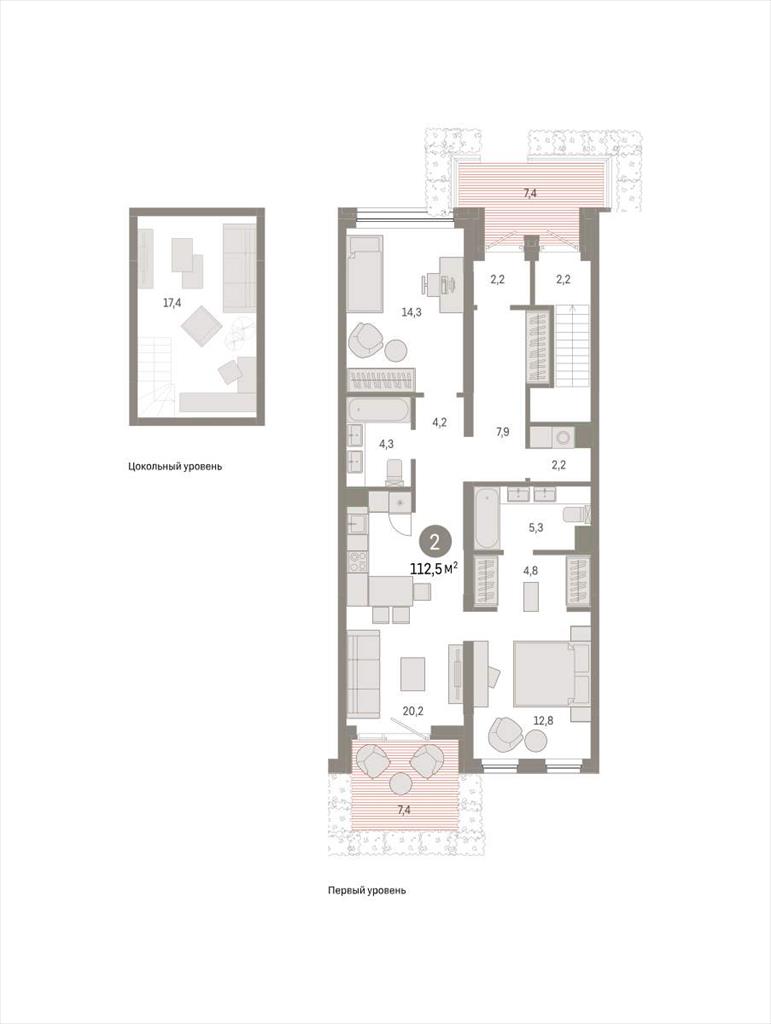 Двухуровневая квартира с кухней-гостиной и двумя спальнями в жилом районе «Зарека». Особенности планировки: панорамное остекление, предчистовая отделка, мастер-спальня, терраса, терраса на крыше, семейная ипотека 4%, двухуровневая, вид во двор, отдельный вход, разнесённые спальни, постирочная.