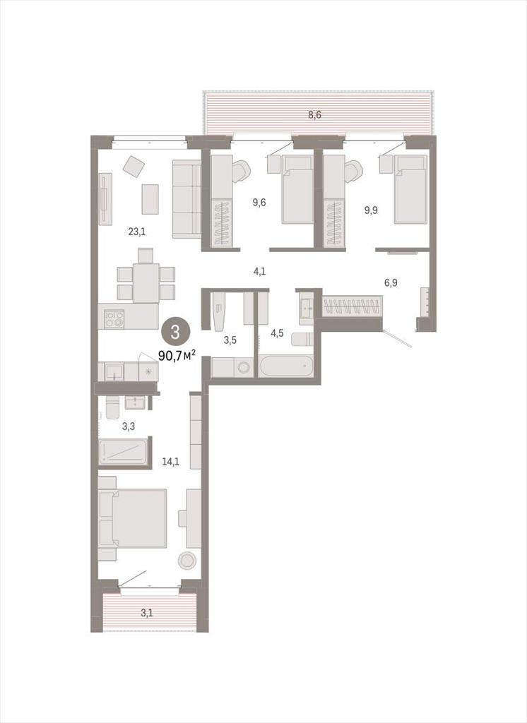 Квартира с кухней-гостиной и тремя спальнями в кварталах «На Минской». Особенности планировки: лоджия, предчистовая отделка, мастер-спальня, балкон, вид во двор, разнесённые спальни, постирочная.