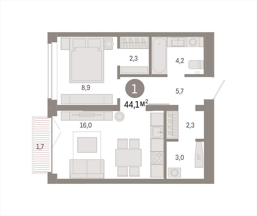 Квартира с кухней-гостиной и одной спальней в жилом районе «Республики 205». Особенности планировки: балкон, гардеробная, ремонт в подарок, постирочная.