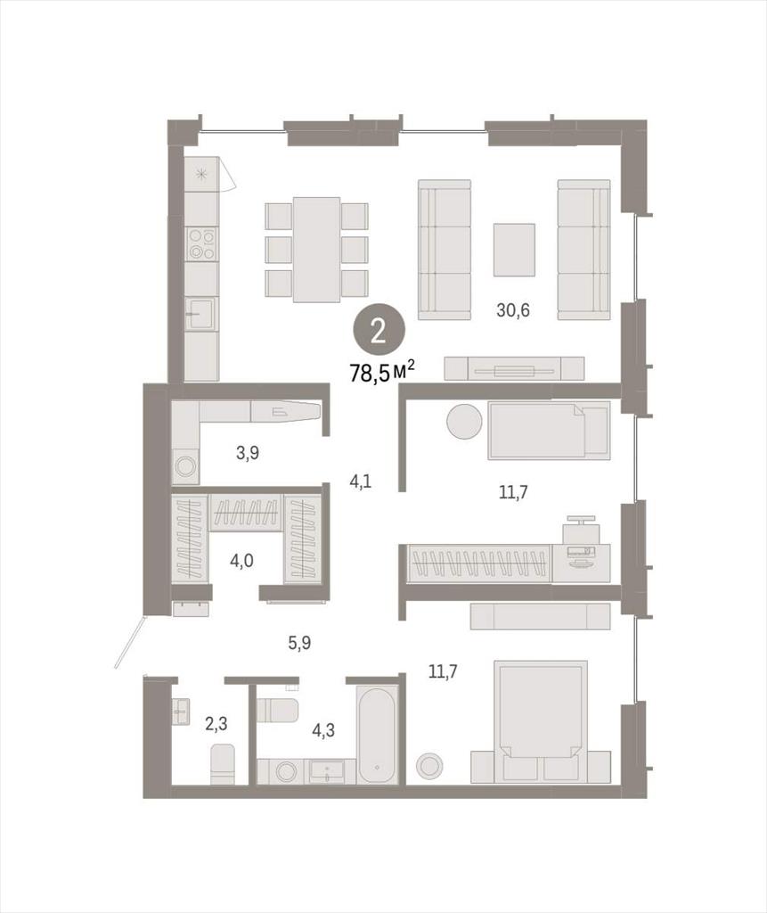 Квартира с кухней-гостиной и двумя спальнями в жилом районе «Республики 205». Особенности планировки: предчистовая отделка, второй санузел, гардеробная, постирочная.
