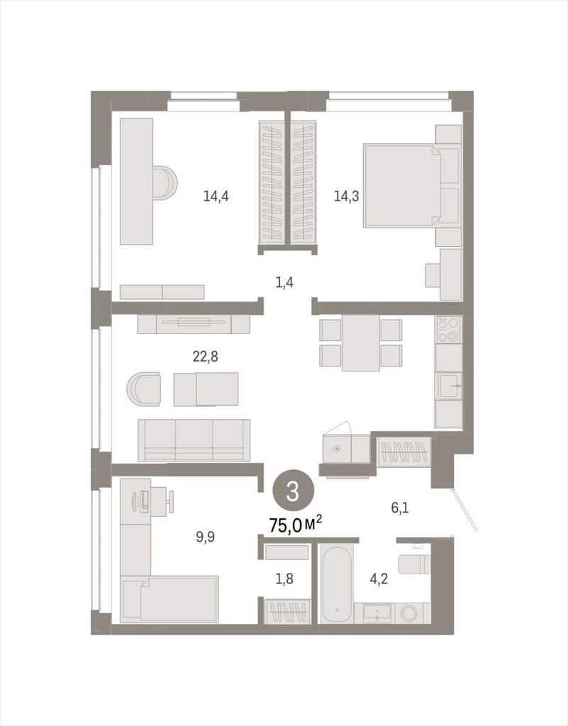 Квартира с кухней-гостиной и тремя спальнями в жилом районе «Республики 205». Особенности планировки: предчистовая отделка, гардеробная, рабочий кабинет, разнесённые спальни.
