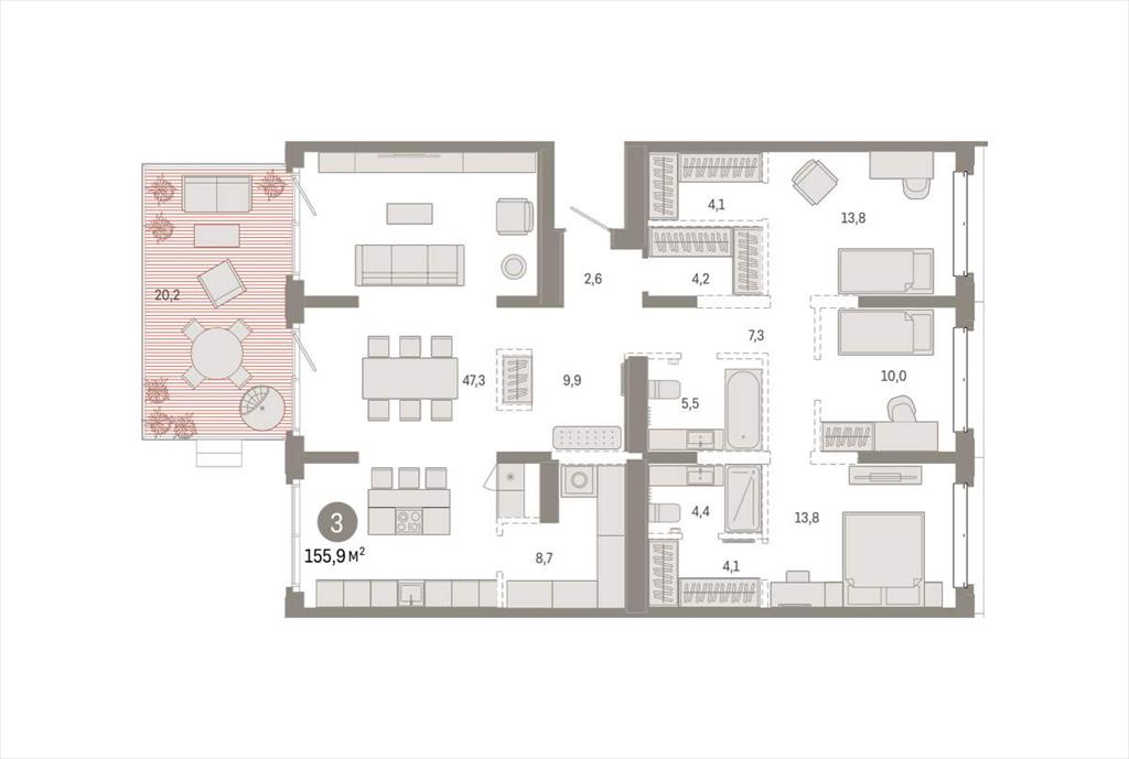 Квартира с кухней-гостиной и тремя спальнями в кварталах «На Минской». Особенности планировки: окна на две стороны, панорамное остекление, предчистовая отделка, мастер-спальня, терраса, гардеробная, окна в пол, рабочий кабинет, вид во двор, разнесённые спальни.