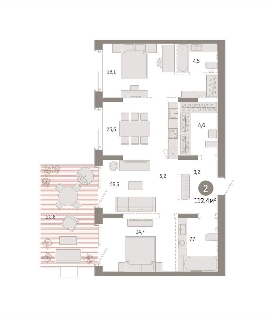 Квартира с кухней-гостиной и двумя спальнями в кварталах «На Минской». Особенности планировки: панорамное остекление, предчистовая отделка, мастер-спальня, терраса, окна в пол, вид во двор, разнесённые спальни.