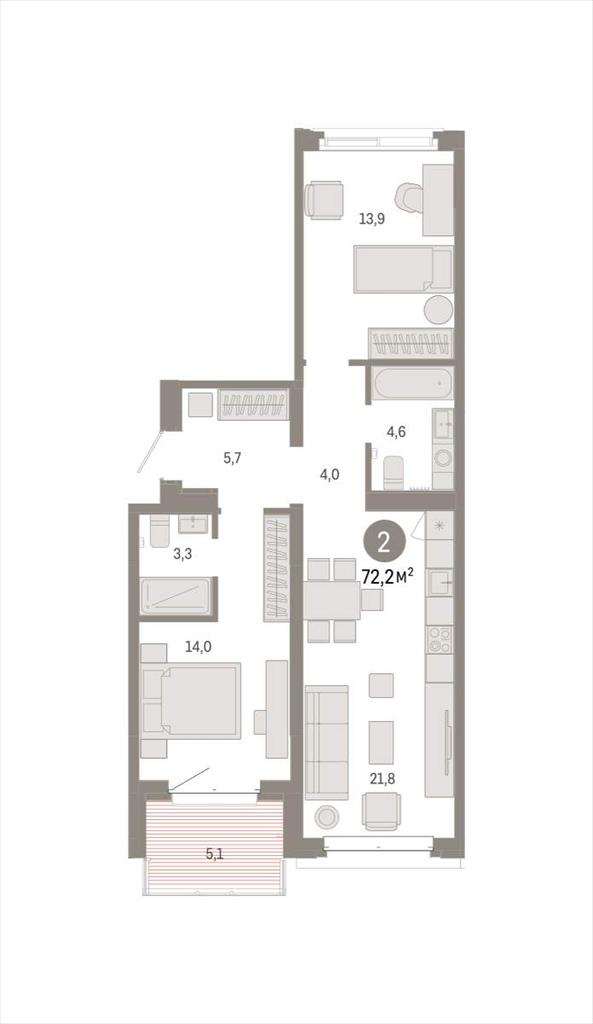 Квартира с кухней-гостиной и двумя спальнями в кварталах «На Минской». Особенности планировки: окна на две стороны, панорамное остекление, лоджия, предчистовая отделка, мастер-спальня, окна в пол, вид во двор, разнесённые спальни.