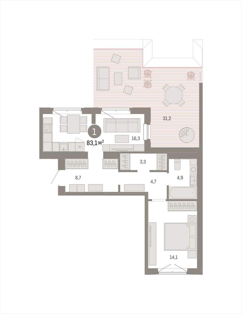 общая 83,14 м2, жилая 14,08 м2, кухни 16,31 м2 |