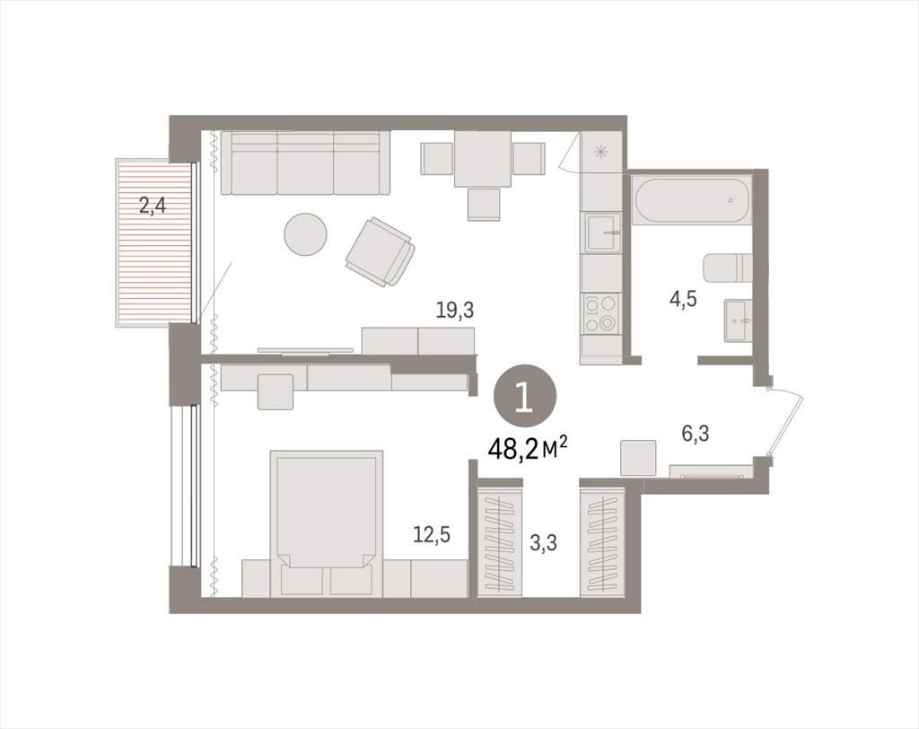 общая 48,16 м2, жилая 12,48 м2, кухни 19,27 м2 |