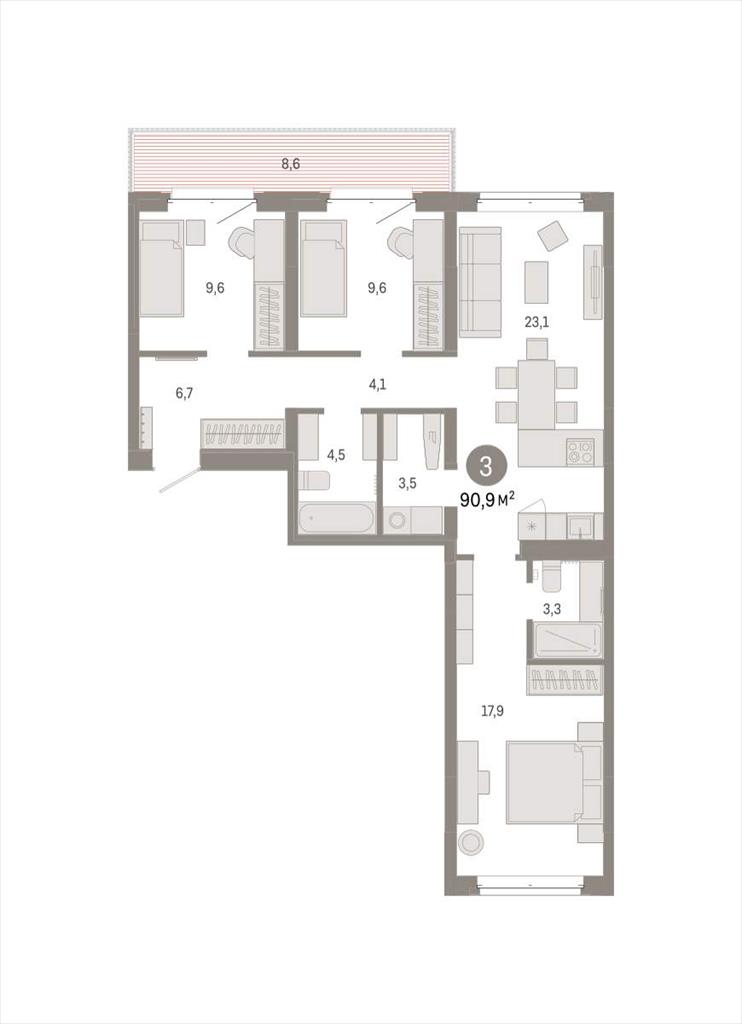 Квартира с кухней-гостиной и тремя спальнями в кварталах «На Минской». Особенности планировки: окна на две стороны, предчистовая отделка, мастер-спальня, балкон, вид во двор, разнесённые спальни, постирочная.