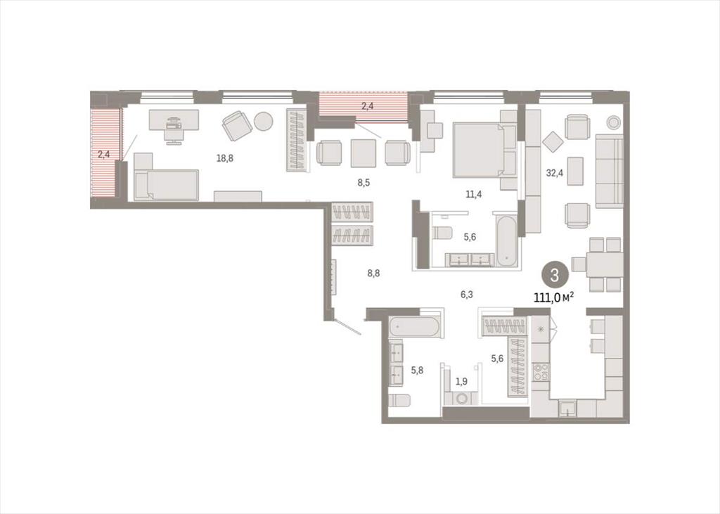 общая 110,97 м2, жилая 38,7 м2, кухни 32,43 м2 |