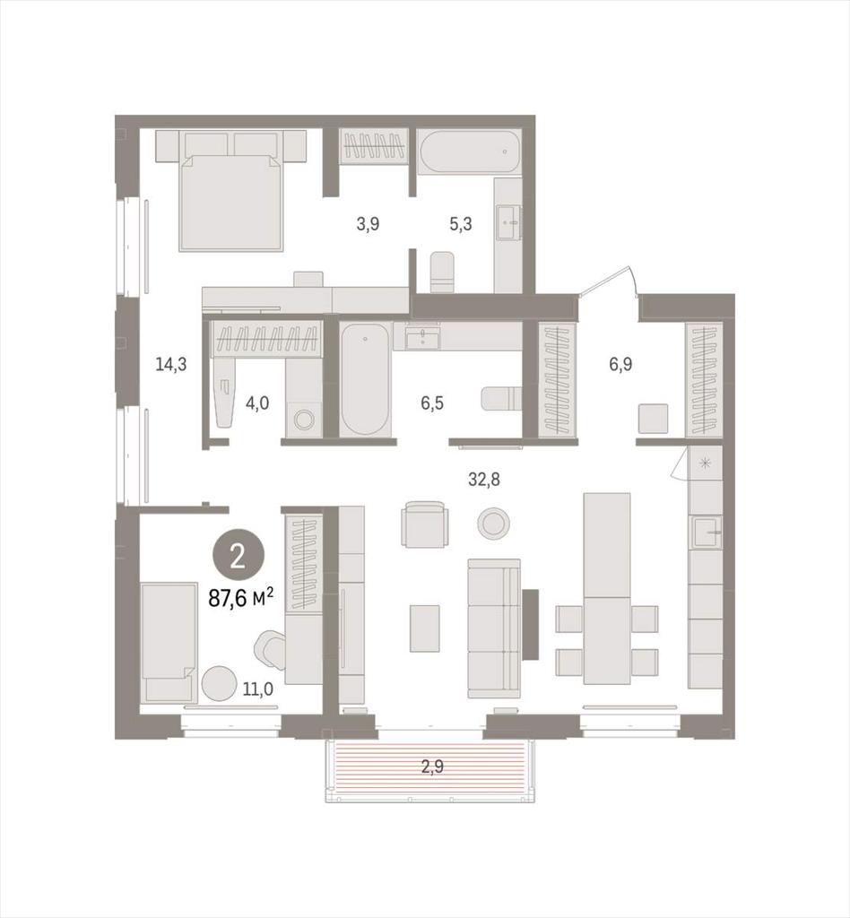 Квартира с кухней-гостиной и двумя спальнями в кварталах «На Минской». Особенности планировки: панорамное остекление, предчистовая отделка, мастер-спальня, балкон, гардеробная.