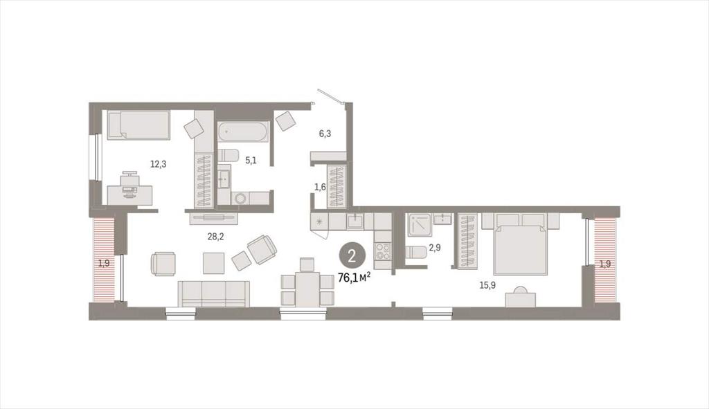 | Квартира с кухней-гостиной и двумя спальнями в жилом районе «Республики 205». Особенности планировки: предчистовая отделка, мастер-спальня, семейная ипотека 4%, гардеробная, вид во двор, тёплая лоджия, разнесённые спальни.