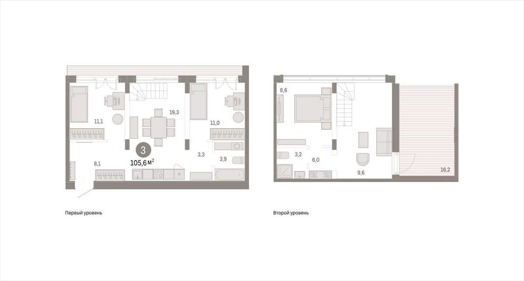 Двухуровневая квартира с кухней-гостиной и тремя спальнями в жилом районе «Республики 205». Особенности планировки: гардеробная, двухуровневая, панорамное остекление, свободная планировка, разнесённые спальни, мастер-спальня, терраса, терраса на крыше.