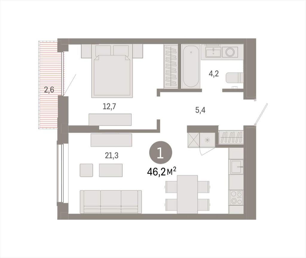 | Квартира с кухней-гостиной и одной спальней в Октябрьском на Туре. Особенности планировки: предчистовая отделка, балкон.