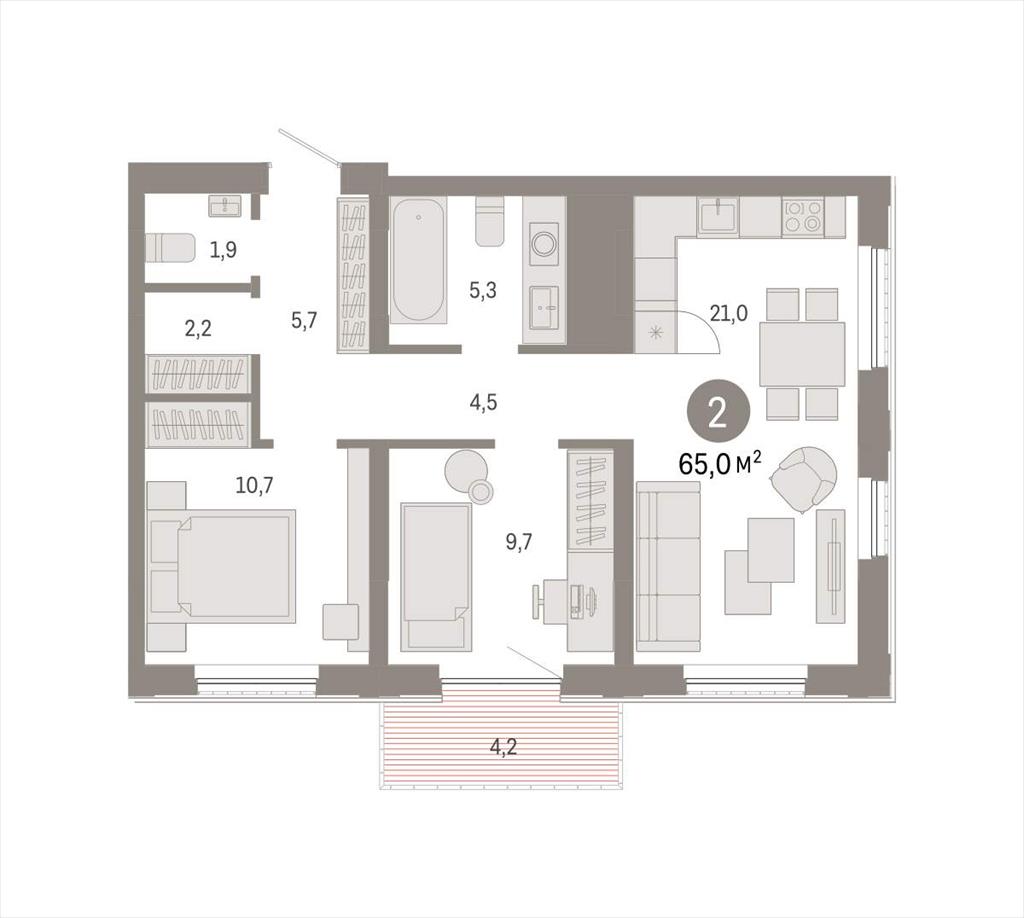 | Квартира с кухней-гостиной и двумя спальнями в Октябрьском на Туре. Особенности планировки: второй санузел, семейная ипотека 4%, гардеробная, вид во двор, предчистовая отделка, балкон.