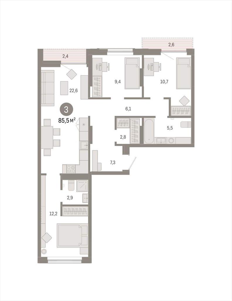 | Квартира с кухней-гостиной и тремя спальнями в Октябрьском на Туре. Особенности планировки: вид во двор, лоджия, разнесённые спальни, предчистовая отделка, мастер-спальня, балкон.