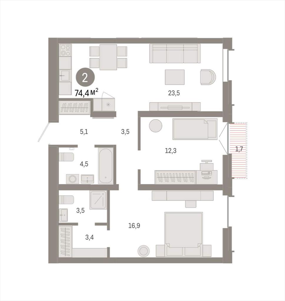 Квартира с кухней-гостиной и двумя спальнями в жилом районе «Республики 205». Особенности планировки: гардеробная, предчистовая отделка, мастер-спальня, балкон.