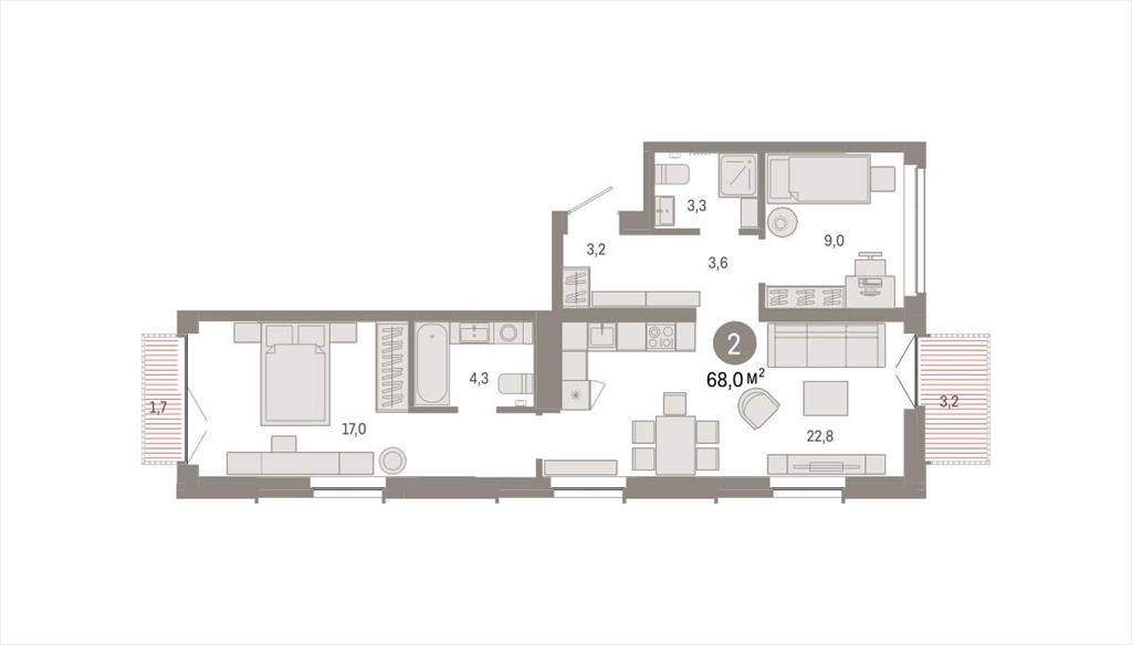 Квартира с кухней-гостиной и двумя спальнями в жилом районе «Республики 205». Особенности планировки: вид во двор, разнесённые спальни, предчистовая отделка, мастер-спальня, балкон.
