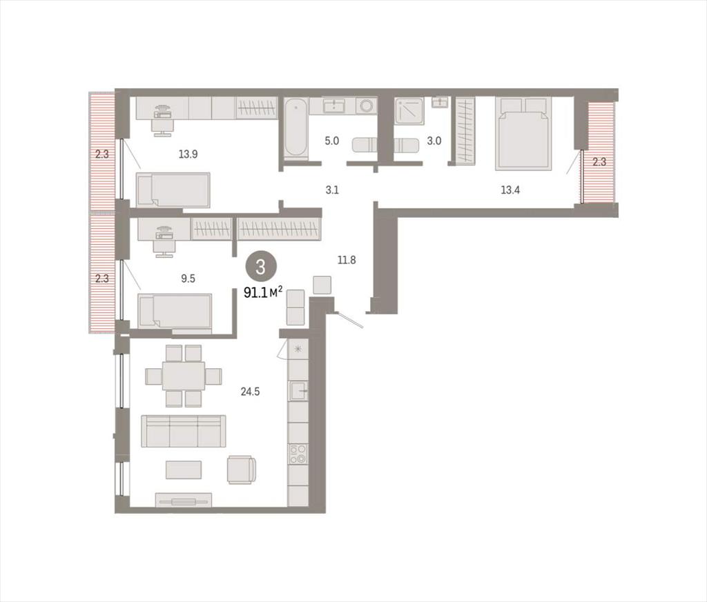 общая 91,13 м2, жилая 36,8 м2, кухни 24,53 м2 |