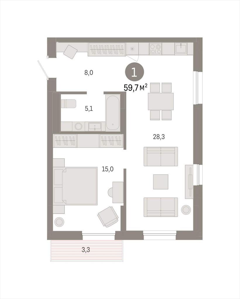 общая 59,65 м2, жилая 15,01 м2, кухни 28,26 м2 |