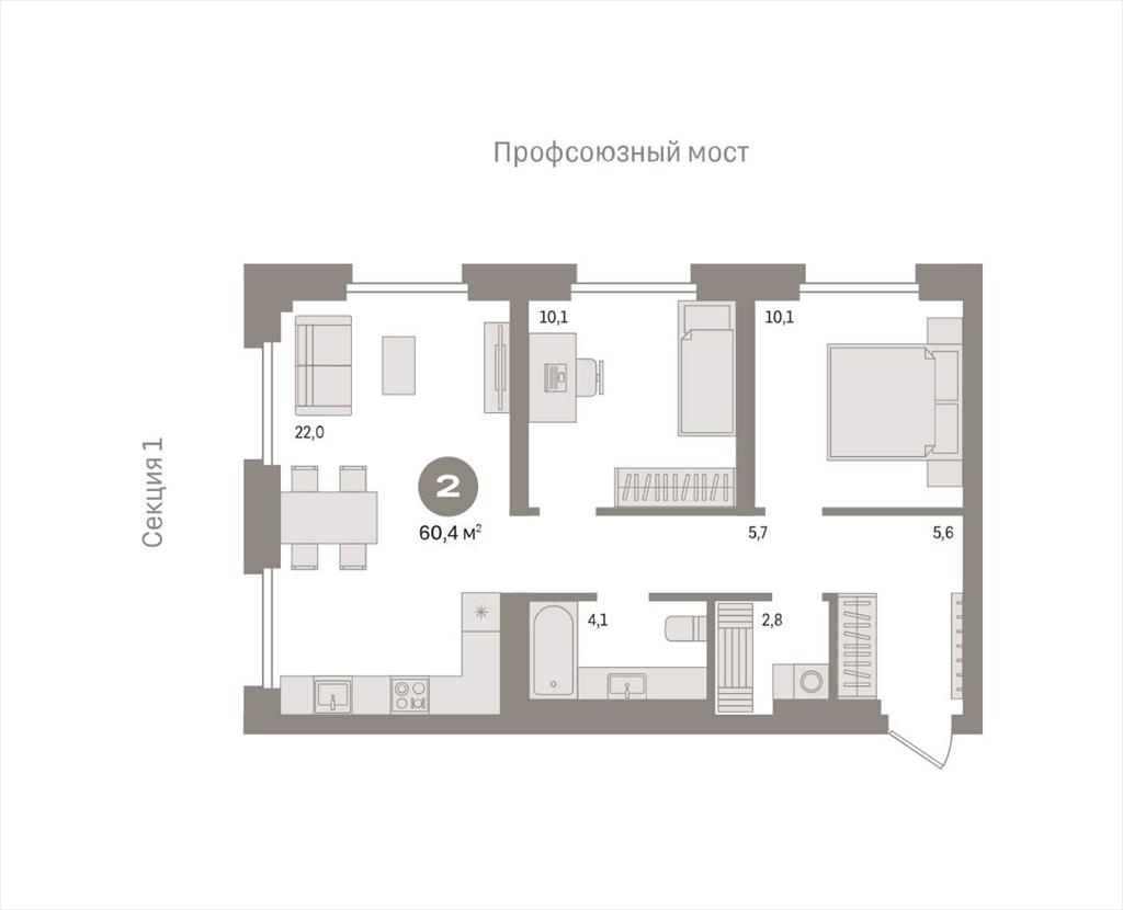 | Квартира с кухней-гостиной и двумя спальнями в жилом районе «Речной порт». Особенности планировки: окна в пол, предчистовая отделка, постирочная.