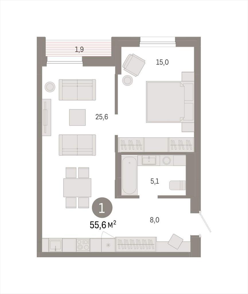 | Квартира с кухней-гостиной и одной спальней в жилом районе «Республики 205». Особенности планировки: тёплая лоджия, лоджия, предчистовая отделка.