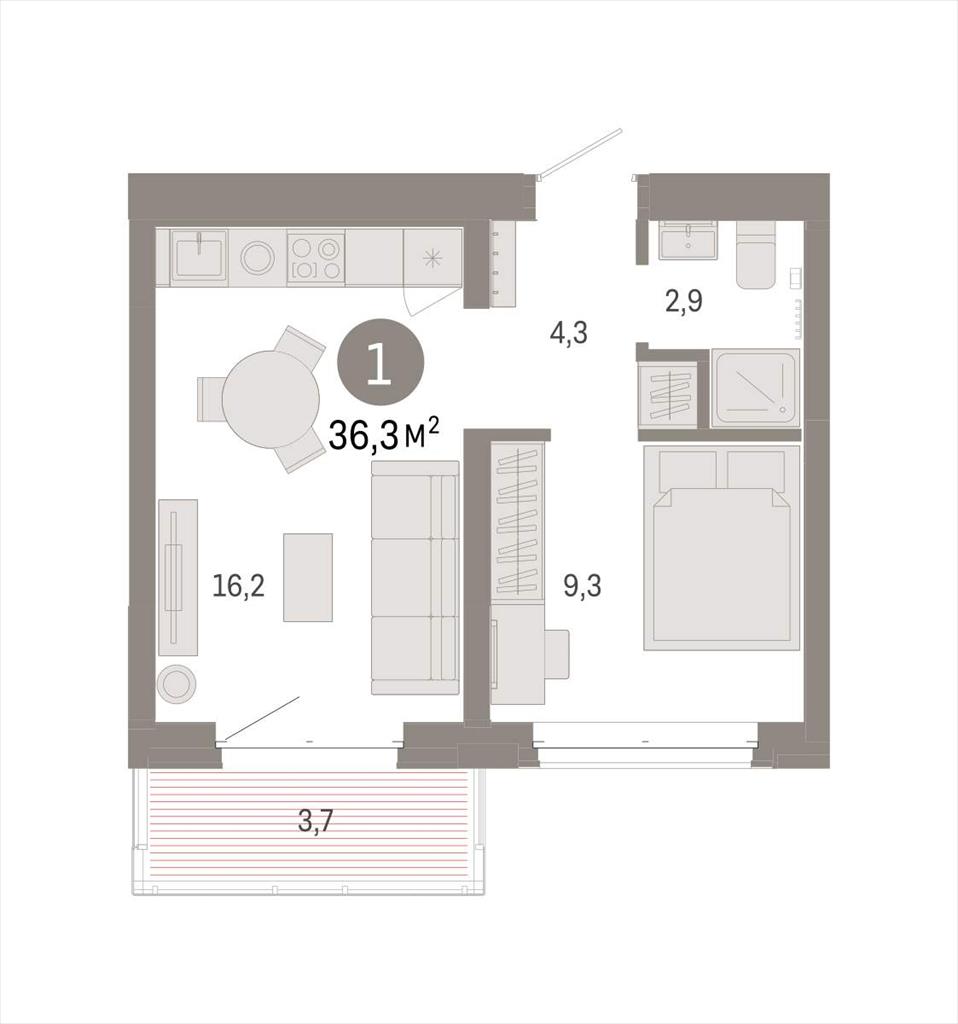 Квартира с кухней-гостиной и одной спальней в кварталах «На Минской». Особенности планировки: вид во двор, предчистовая отделка, балкон.