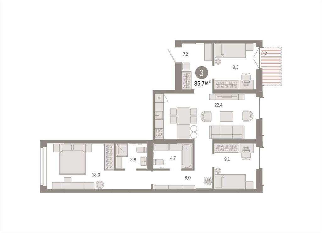 Квартира с кухней-гостиной и тремя спальнями в жилом районе «Республики 205». Особенности планировки: вид во двор, разнесённые спальни, предчистовая отделка, мастер-спальня, балкон.