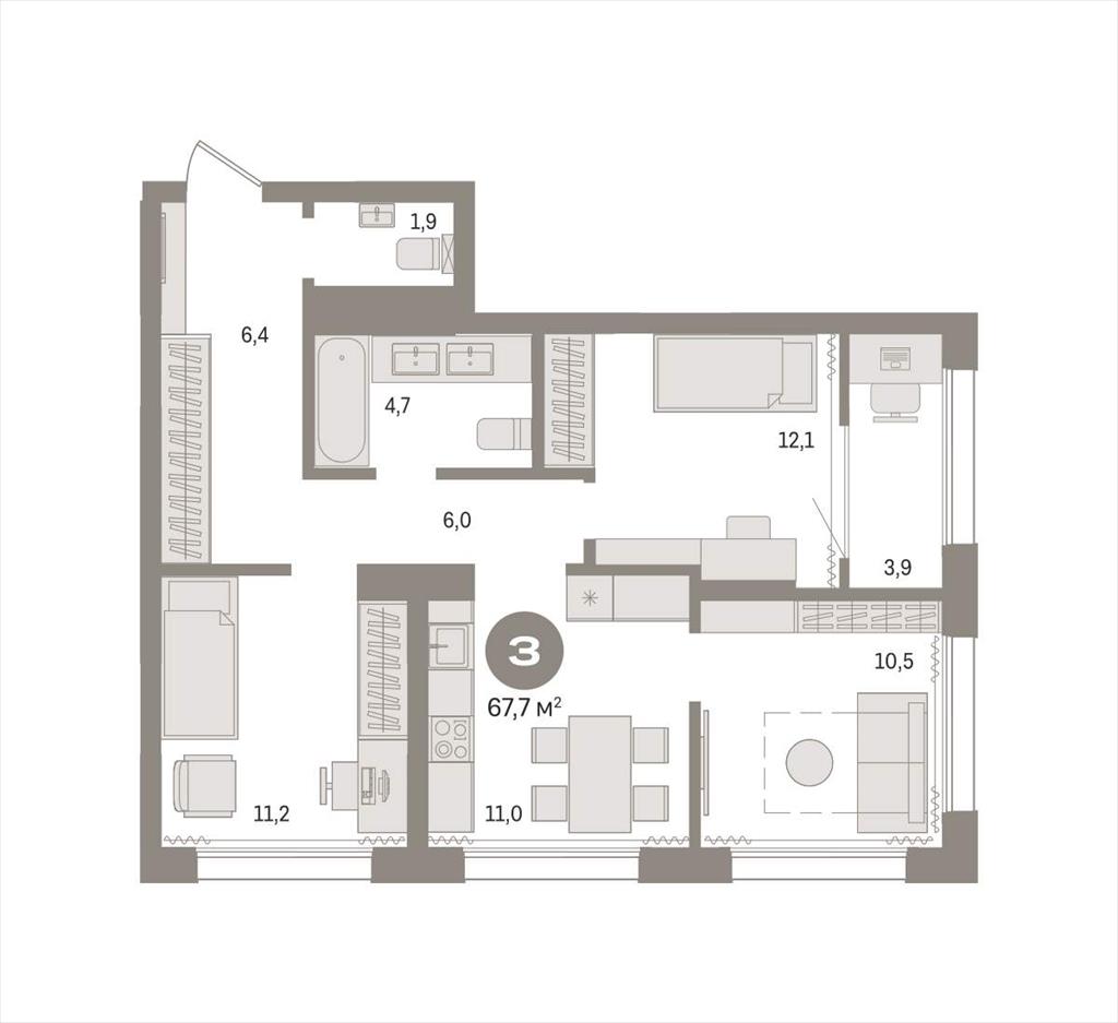 | Квартира с кухней-гостиной и двумя спальнями в Октябрьском на Туре. Особенности планировки: второй санузел, вид во двор, тёплая лоджия, предчистовая отделка.