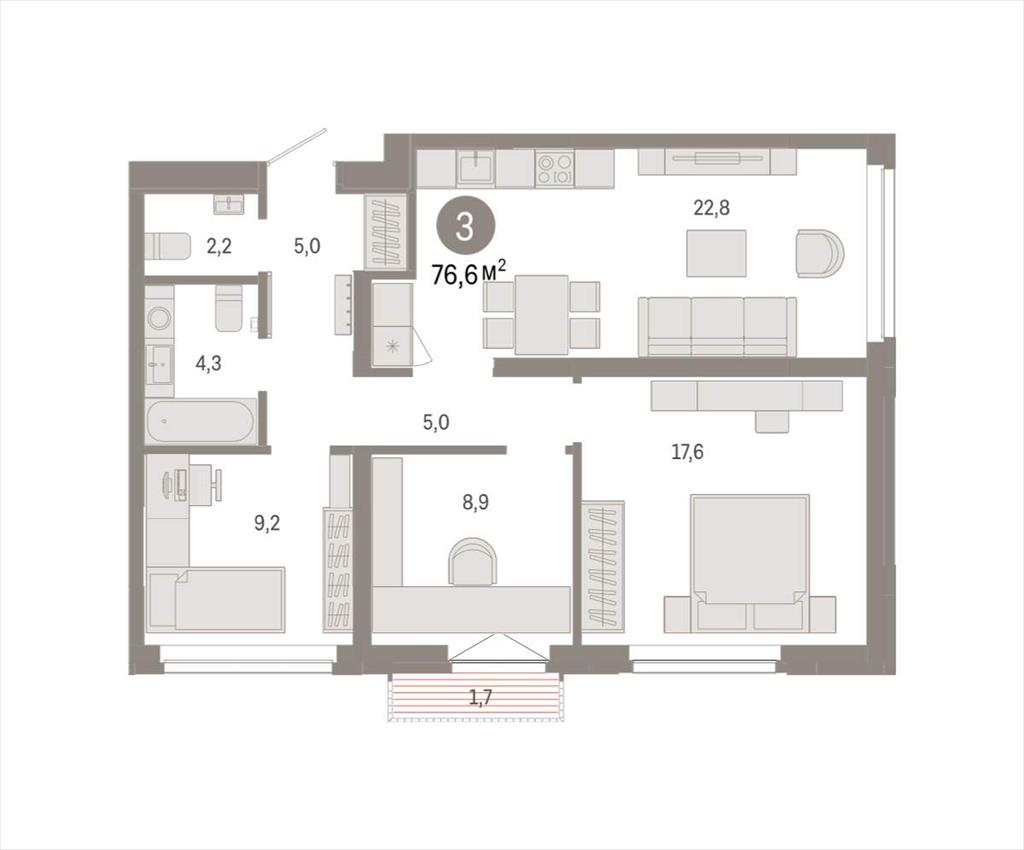 Квартира с кухней-гостиной и тремя спальнями в жилом районе «Республики 205». Особенности планировки: второй санузел, рабочий кабинет, разнесённые спальни, предчистовая отделка, балкон.