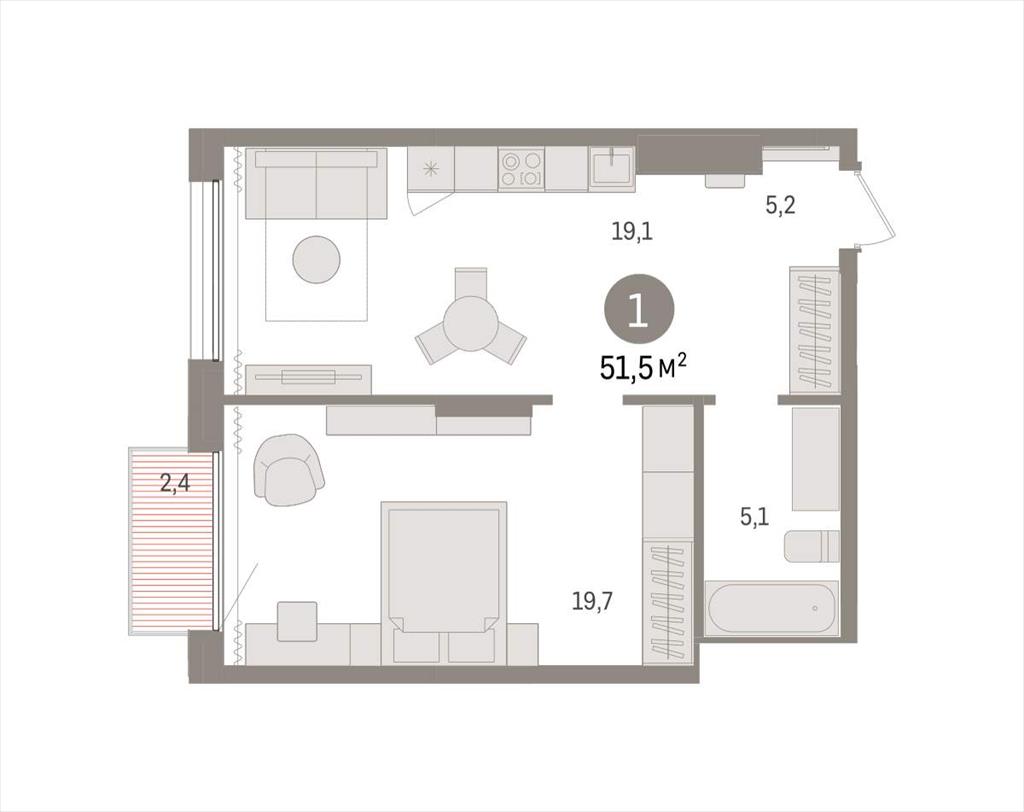 общая 51,47 м2, жилая 19,71 м2, кухни 19,06 м2 |