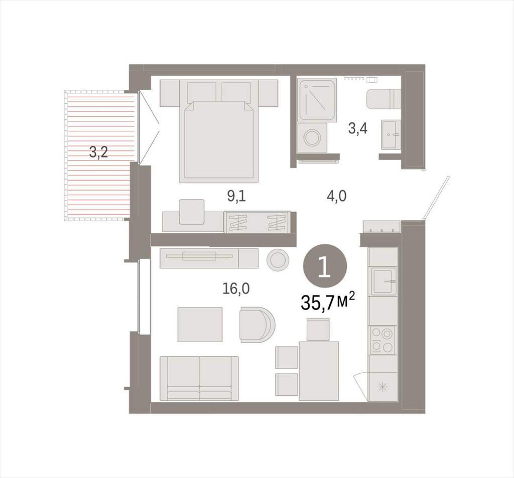 Квартира с кухней-гостиной и одной спальней в жилом районе «Республики 205». Особенности планировки: вид во двор, предчистовая отделка, балкон.