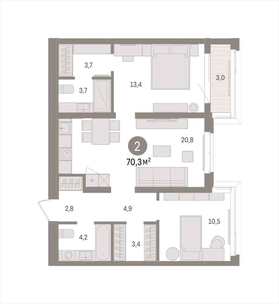 Квартира с кухней-гостиной и двумя спальнями в кварталах «На Минской». Особенности планировки: гардеробная, разнесённые спальни, предчистовая отделка, мастер-спальня, балкон.